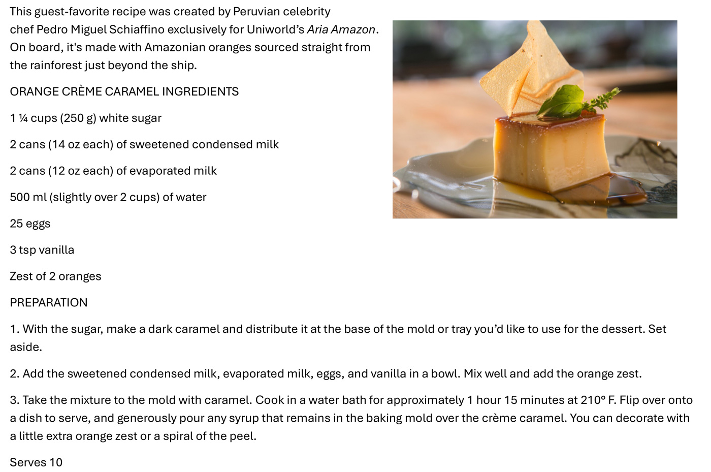 Bring the flavors of the Amazon home with this Orange Crème Caramel recipe from chef Pedro Miguel Schiaffino, featured aboard the Aria Amazon.